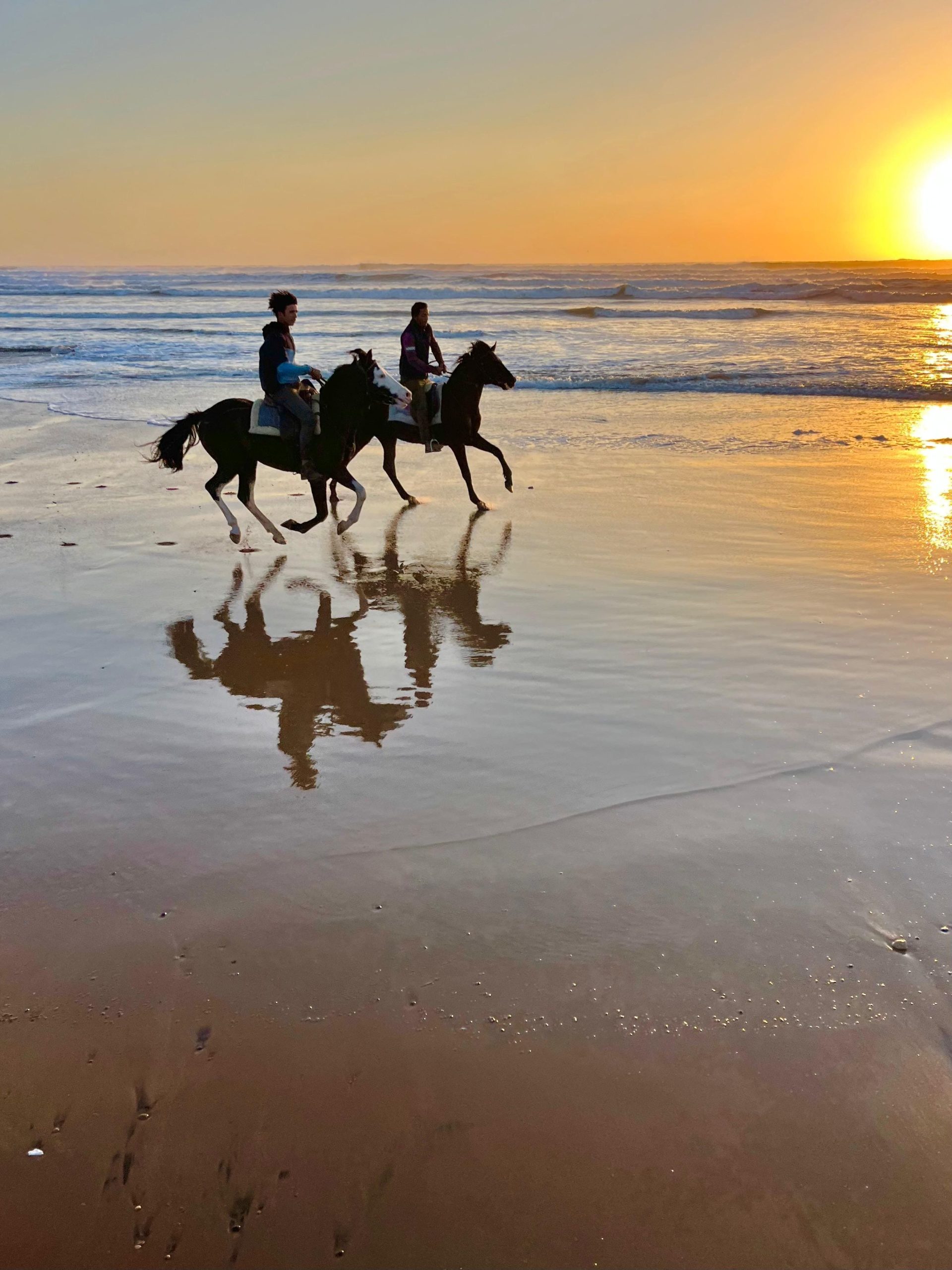 Nie myślcie, że to już koniec – ten dzień przyniesie niezapomniane emocje! Wyruszymy malowniczą trasą wzdłuż Atlantyku w kierunku Essaouiry, podziwiając surowe piękno wybrzeża. Po drodze zatrzymamy się na posiłek – jeśli Ocean okaże się łaskawy, zjemy w zacisznej grocie, gdzie fale rozbijają się o skalne ściany, tworząc niepowtarzalny klimat. A jeśli natura zdecyduje inaczej, czeka na nas równie magiczna opcja – lunch na szczycie klifu z zapierającym dech w piersiach widokiem na bezkres wód Atlantyku. W drodze powrotnej doświadczymy plaży i galopów przez szerokie, piaszczyste przestrzenie, gdzie wiatr i szum fal tworzą idealną symfonię. Nie tylko my kochamy ten moment – nasze konie również czerpią z niego czystą radość! Wieczorem czeka na nas aromatyczna kolacja, która pozwoli na chwilę odpoczynku i celebrację cudownych przeżyć tego intensywnego dnia. Nocleg w obozie namiotowym z dostępem do toalety i prysznica.